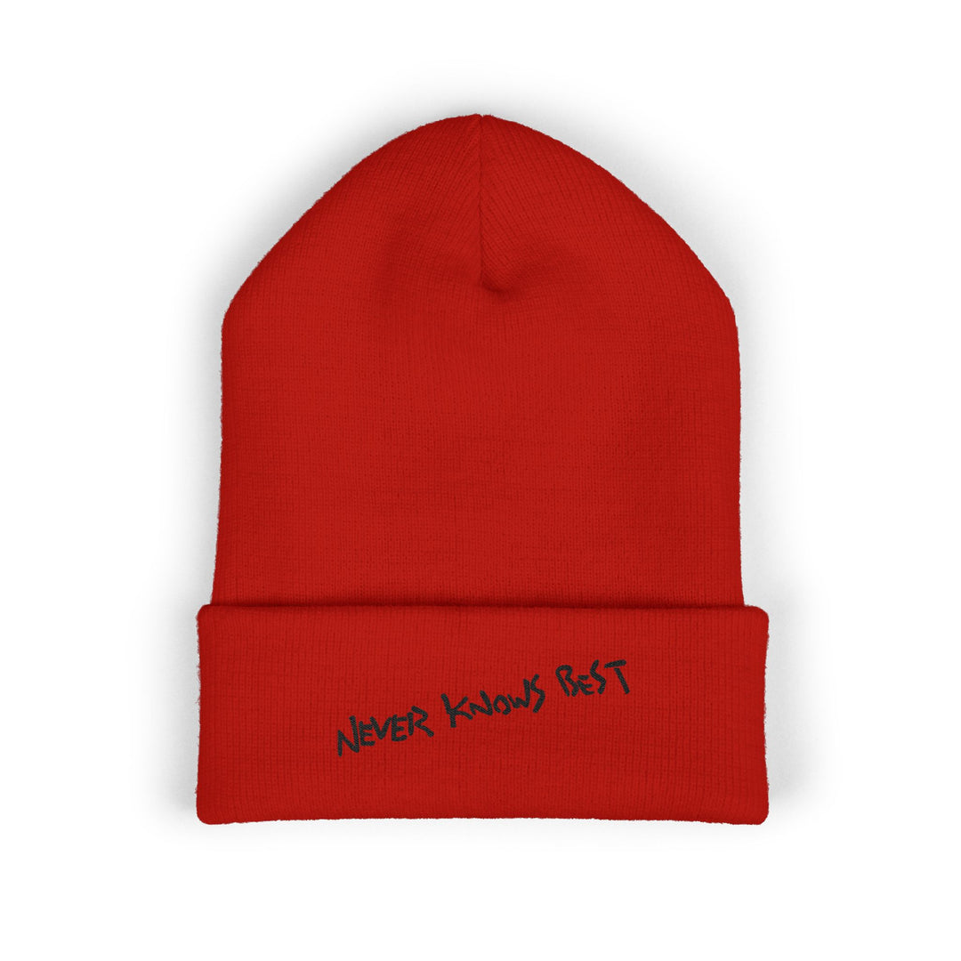 Embroidered Cuffed Beanie — 'Never Knows Best' Red Knit Hat
