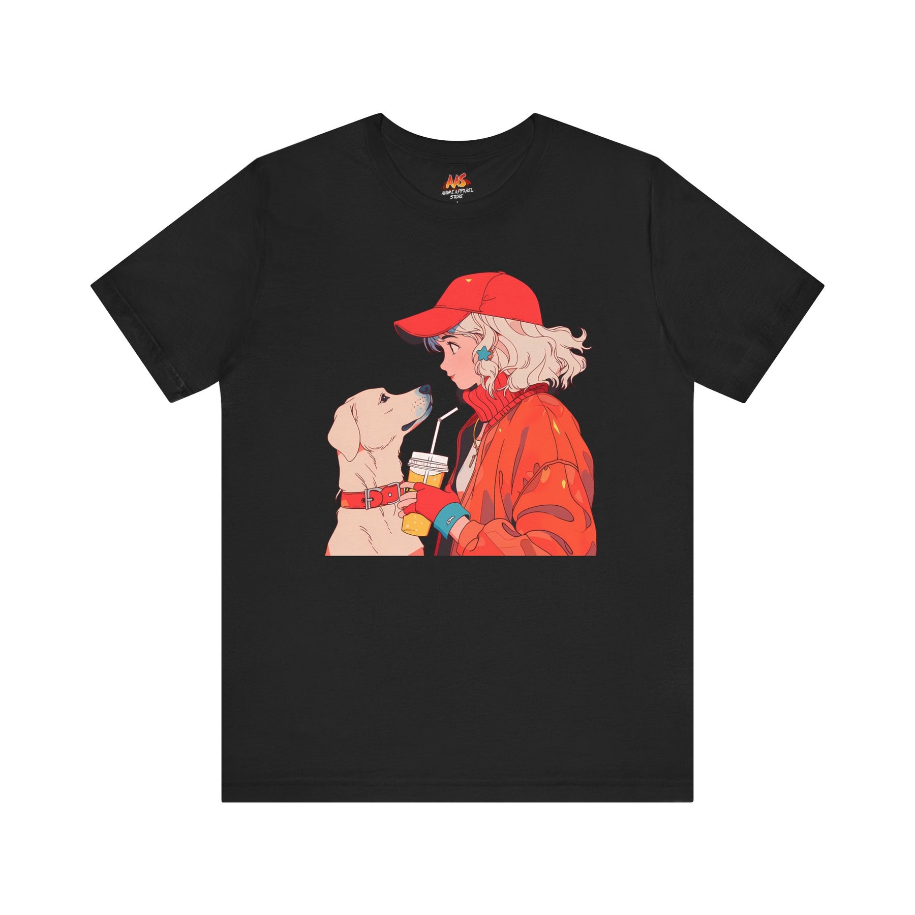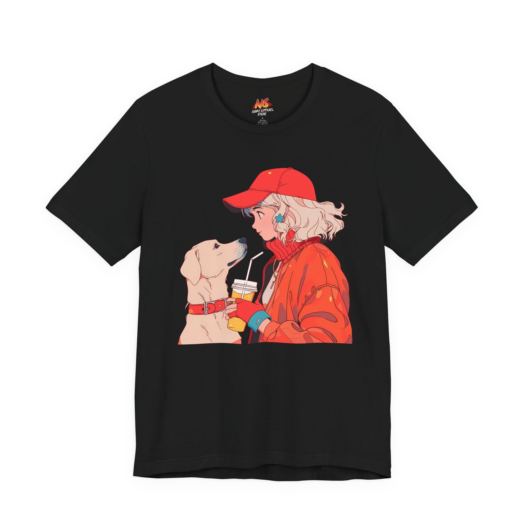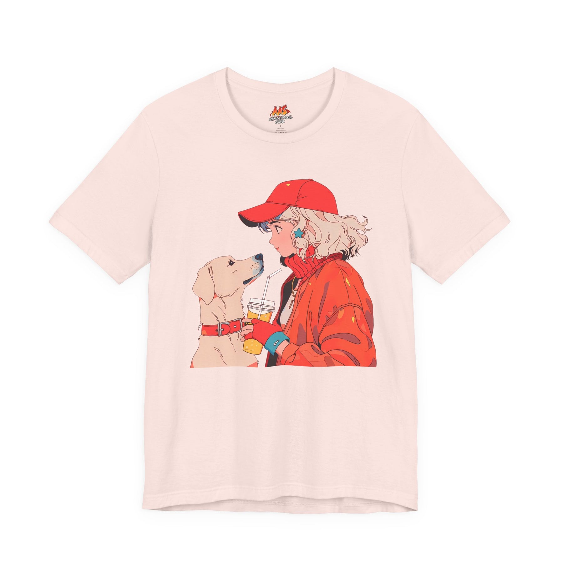 Serving 80s anime slice-of-life realness, this heart-melting graphic captures that perfect moment between a girl and her loyal pup. Drenched in a retro-orange palette with crisp details—like star earrings, lemonade in-hand, and matching accessories—this piece is for the ones who understand the power of simple joys and soft loyalty.