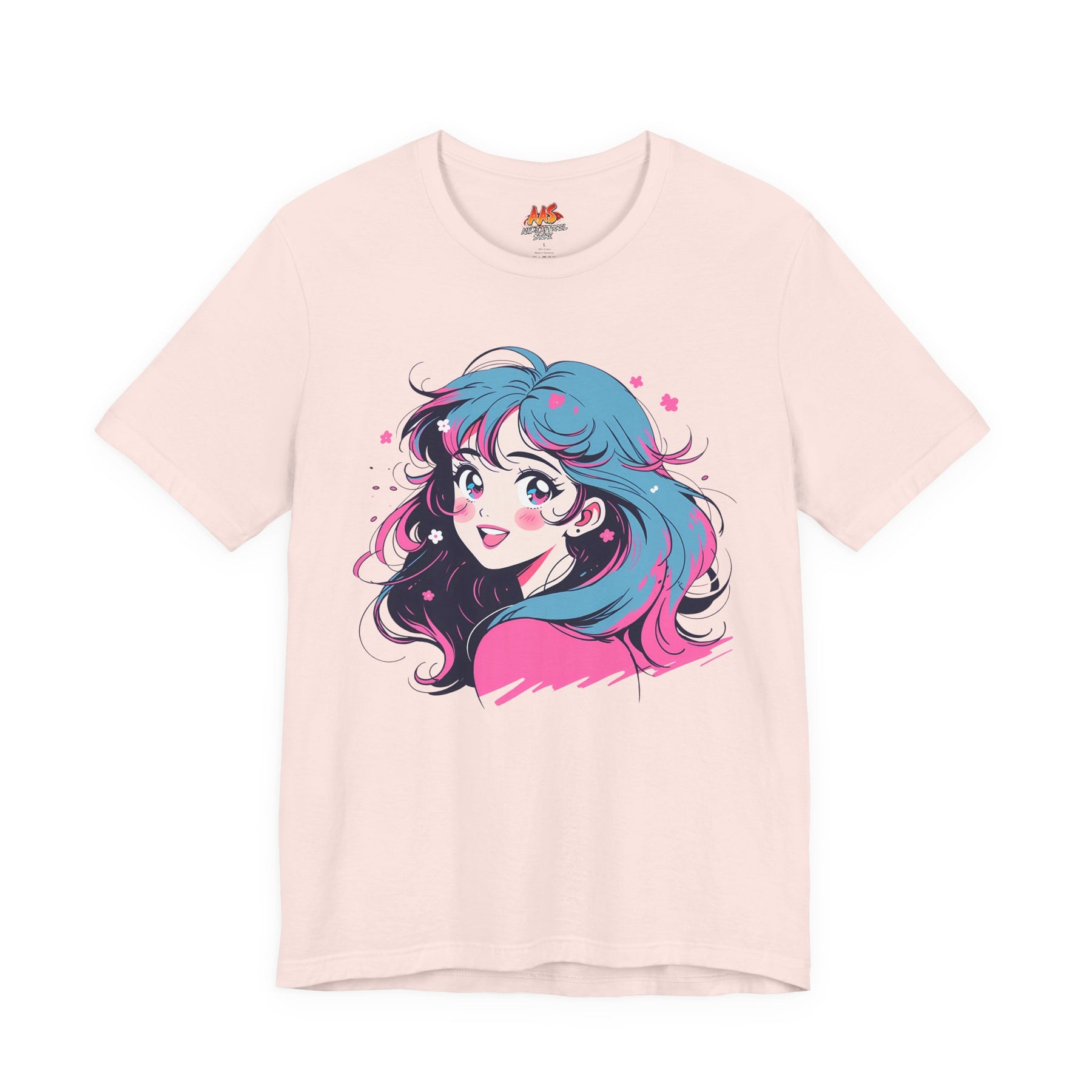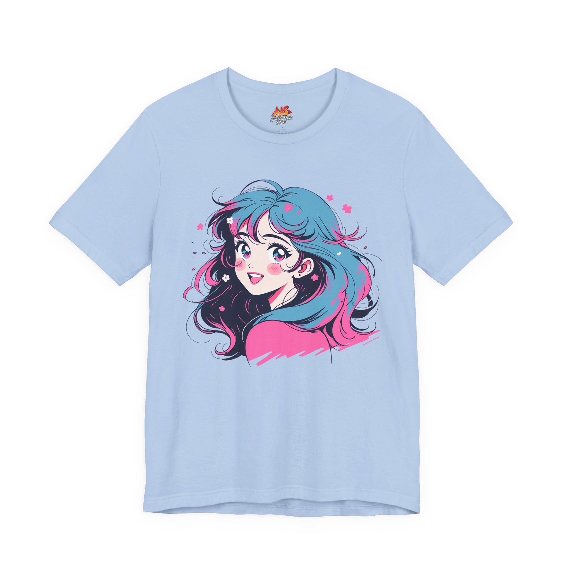 Say hello to retro charm at its bubbliest. This vibrant anime design features a joyful heroine with teal and pink hair, surrounded by cherry blossoms and pastel energy. Her sparkling smile and bold color palette bring the spirit of 80s shoujo and pop art together in a perfect blend of cute and cool. For fans who live for aesthetic overload, heart-eyes, and unapologetic joy.