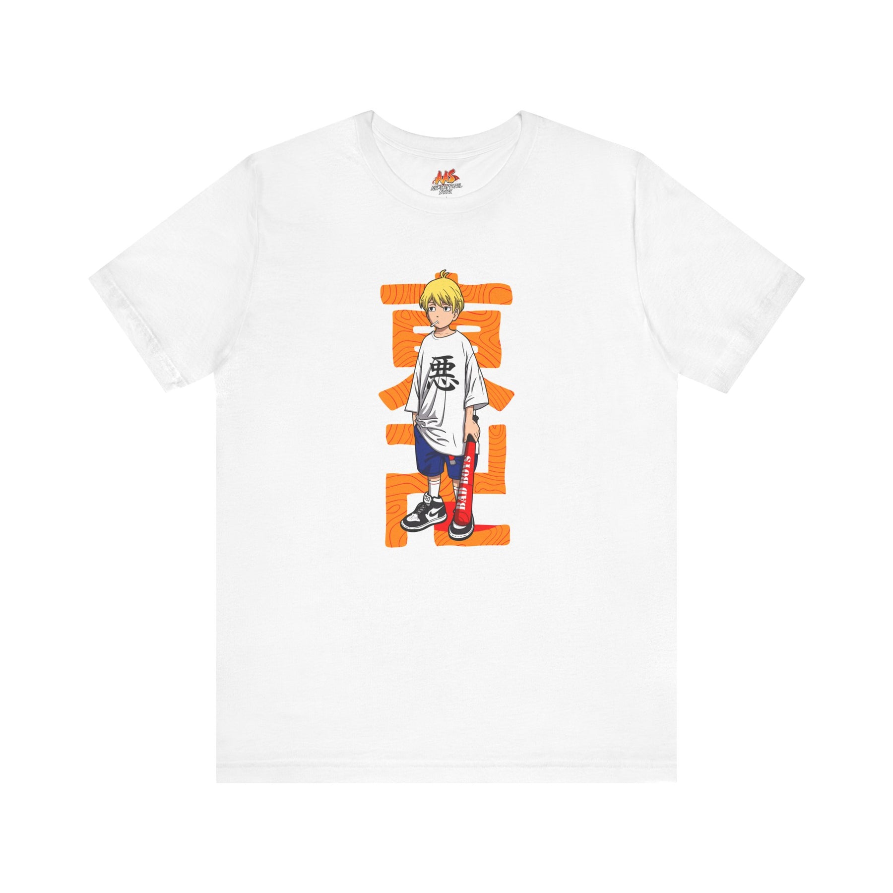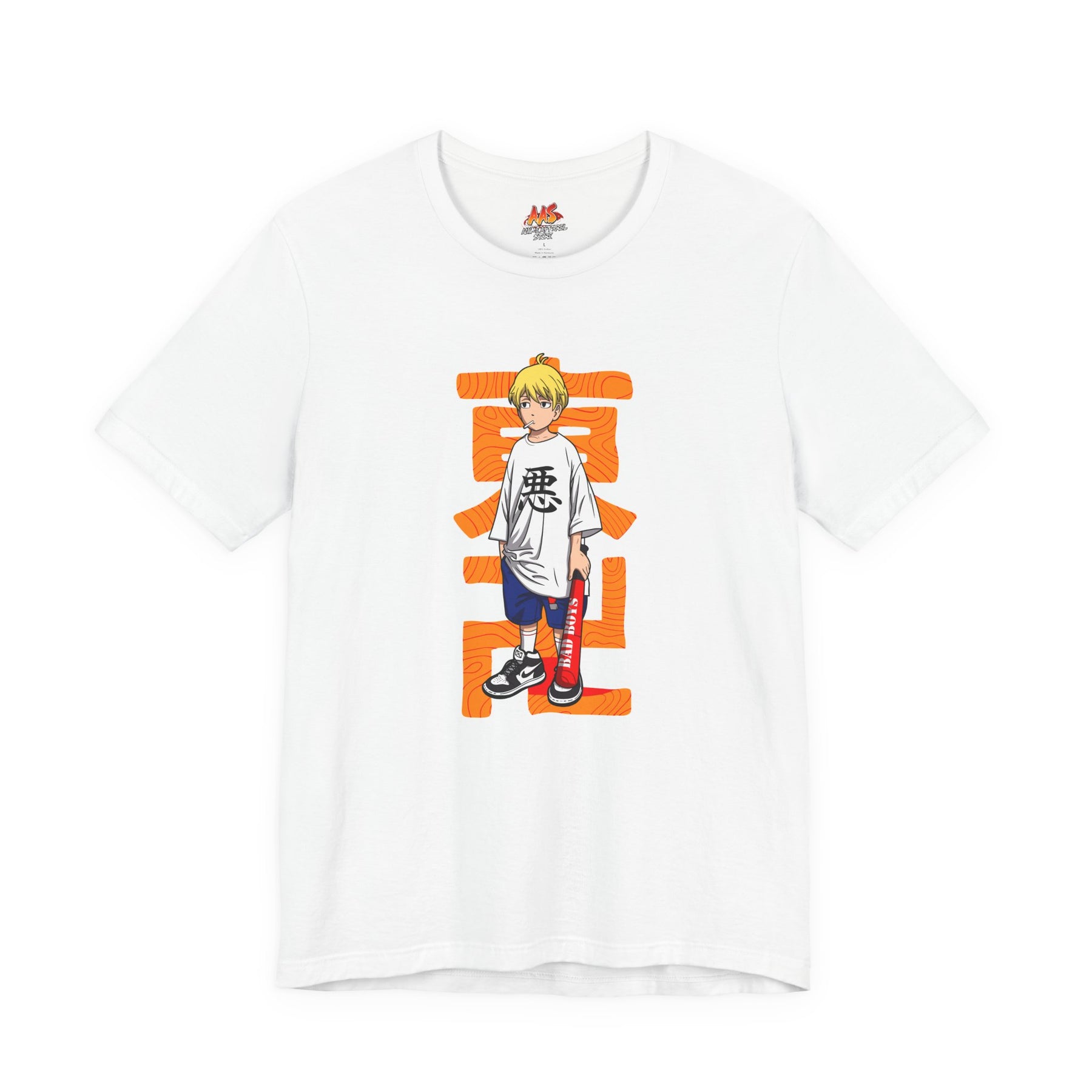 Who says chaos can’t be stylish? This Tokyo Revengers-inspired graphic features a street-styled take on one of anime’s most chaotic characters, reimagined with modern urban flair. Rocking a bold “悪” (evil) kanji tee, loose-fit shorts, high-top sneakers, and a candy-stick attitude, this design fuses retro delinquent vibes with streetwear heat.