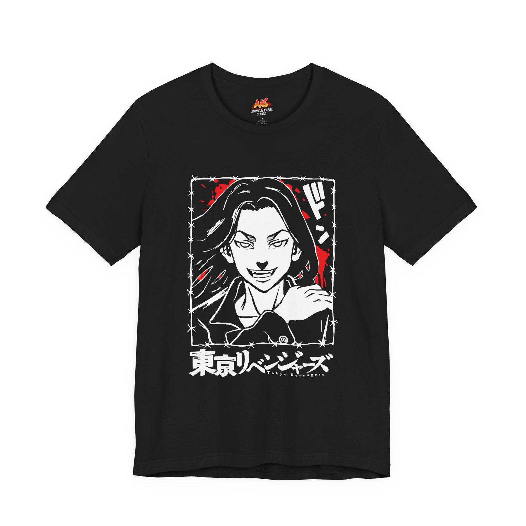 Unhinged. Untouchable. Unforgettable. This Tokyo Revengers graphic captures Shuji Hanma in his purest form—grinning through the madness like he owns every street he's ever stained red. Barbed wire borders and splashes of crimson set the tone for a design that screams danger with style.