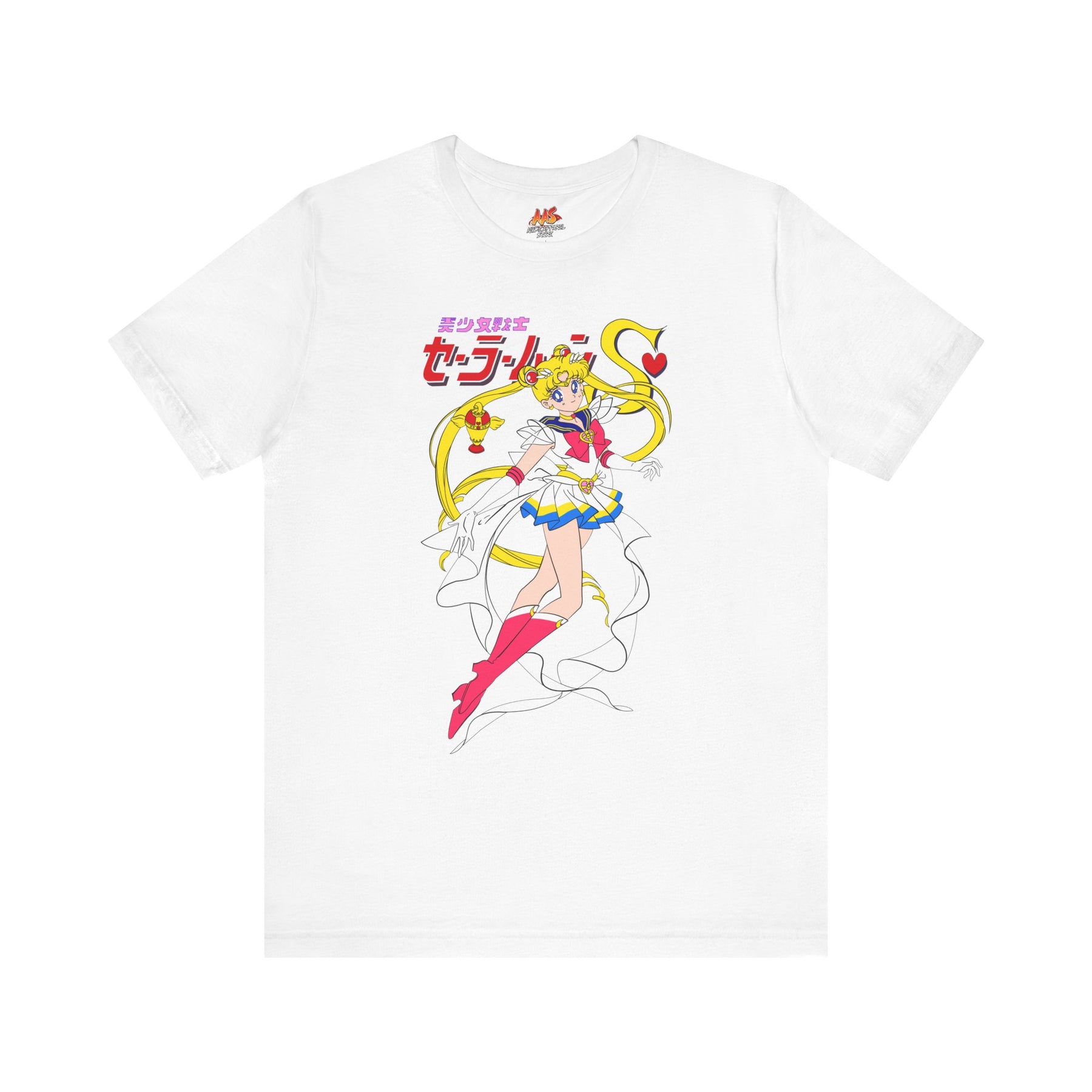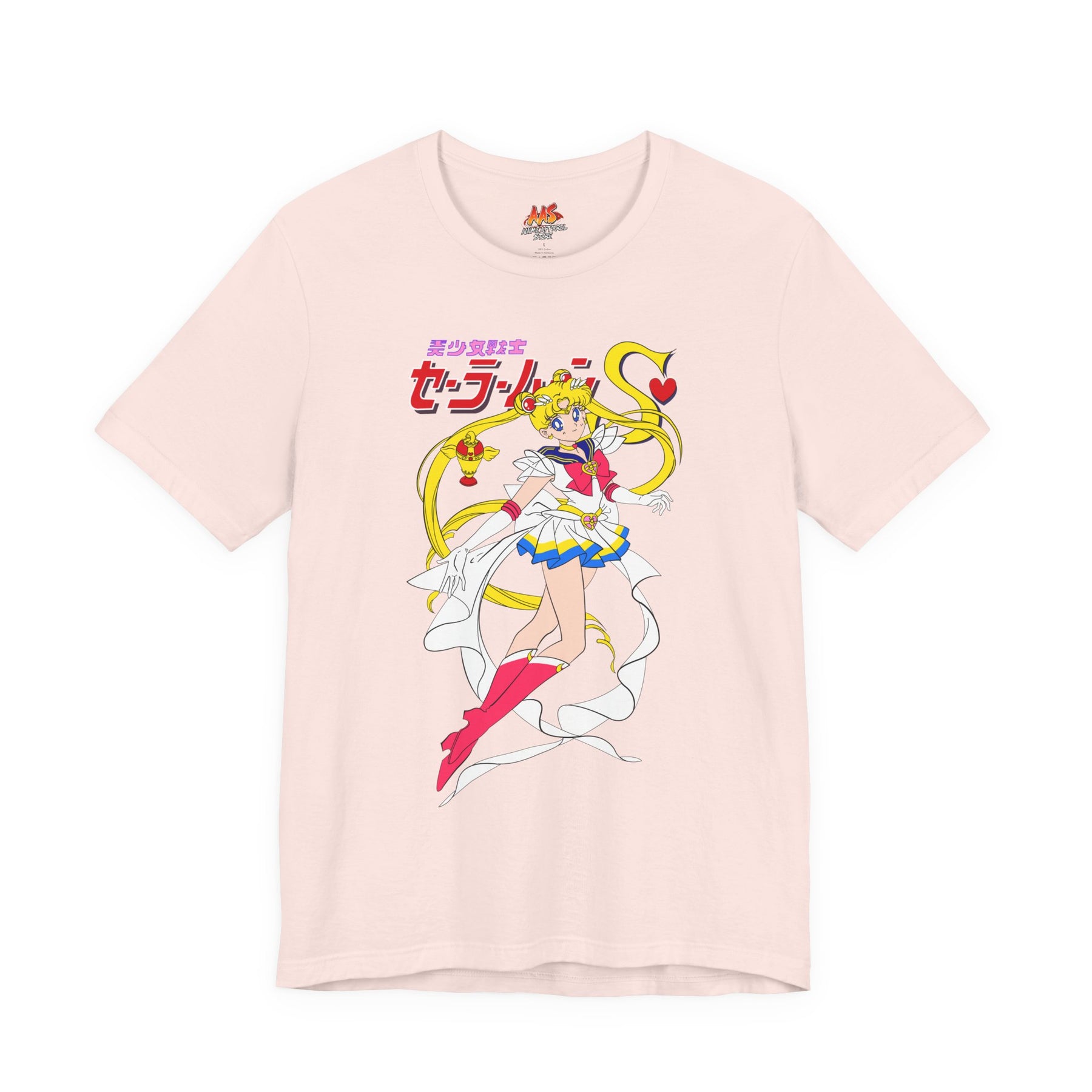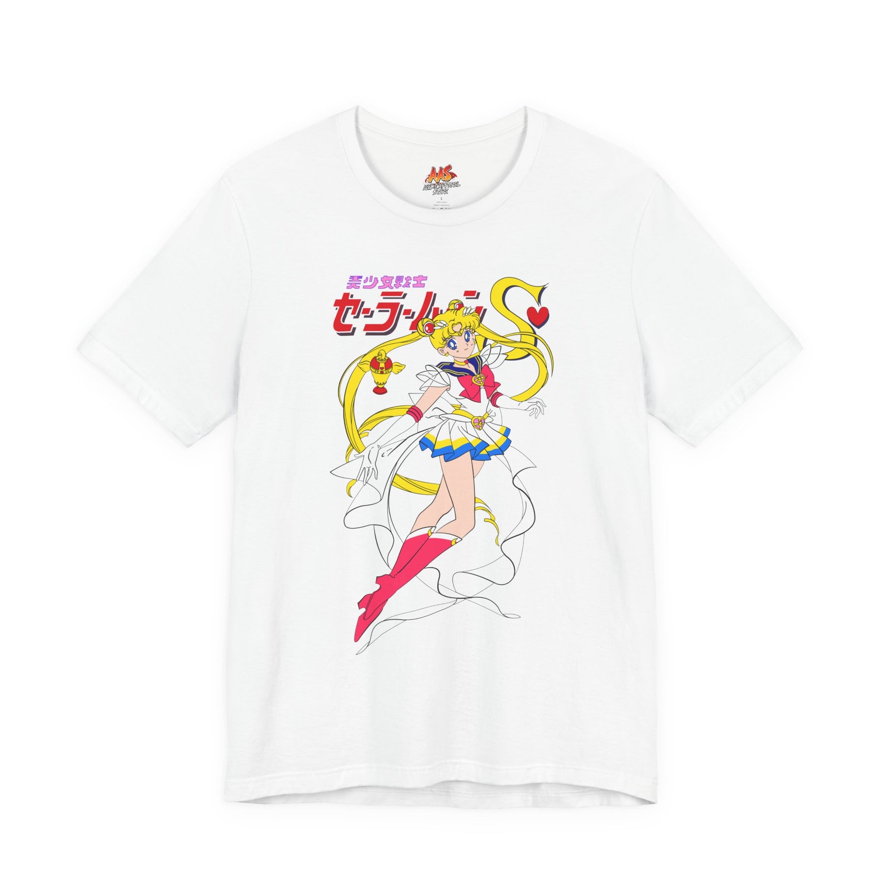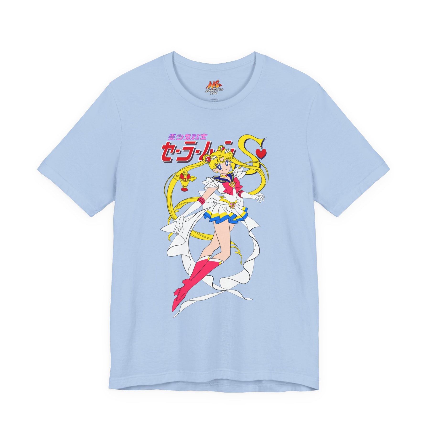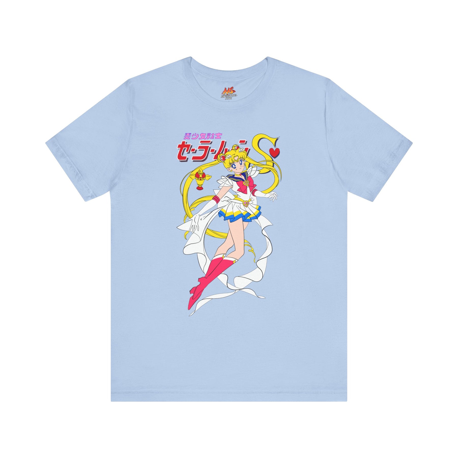 This design radiates celestial energy with an iconic magical girl heroine in her Super Sailor transformation. Featuring bold colors, galactic ribbon details, and her sacred chalice in tow, it’s a tribute to strength, elegance, and transformation. Made for true fans who lived through every phase of the moon. Not your average magical girl tee—this one’s for those who remember the brooch upgrades. Exclusive to Anime Apparel Store.