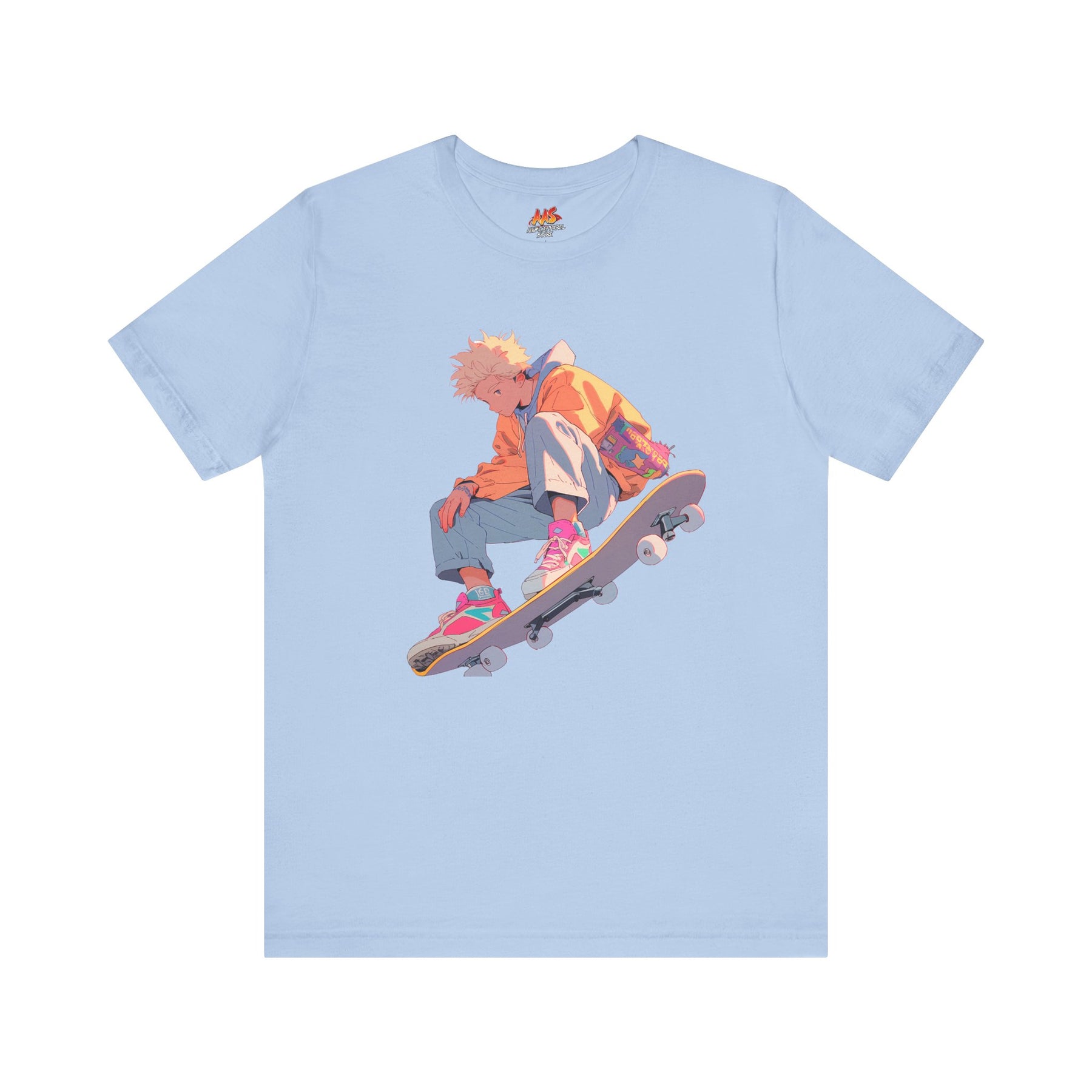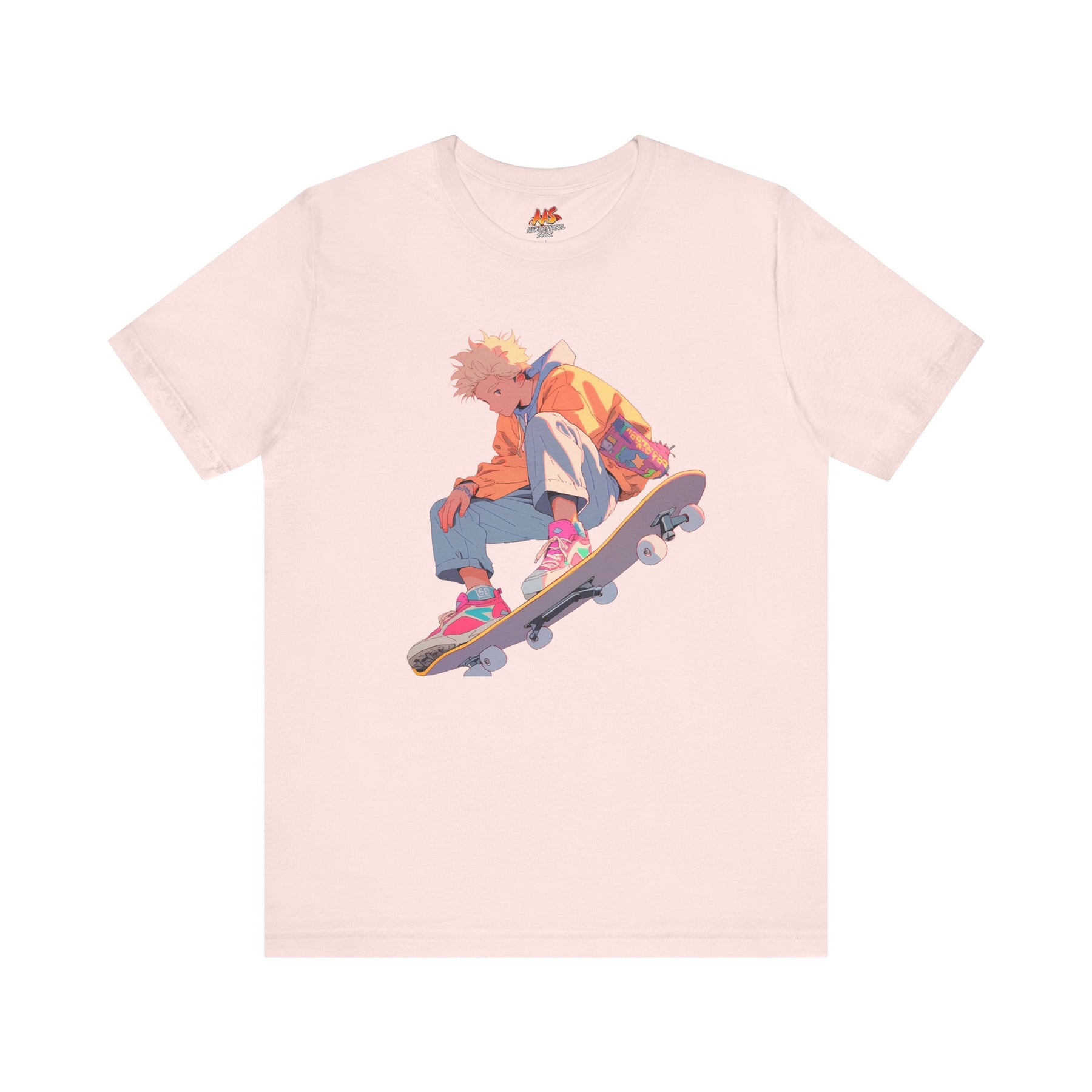 Hit the airwaves and the asphalt with this high-flying 80s anime-inspired skate design. Decked out in vibrant pastel kicks and an oversized windbreaker, this character captures everything that made the golden age of anime rebellious and effortlessly cool. Whether you're a fan of old-school OVAs, underground zines, or that one skateboarding scene in every vintage anime that made no sense—but looked incredible—this piece brings that raw energy back to life. Pop colors, lo-fi shadows, and a "too cool to care" expression… this one's for the real ones chasing freedom frame by frame.